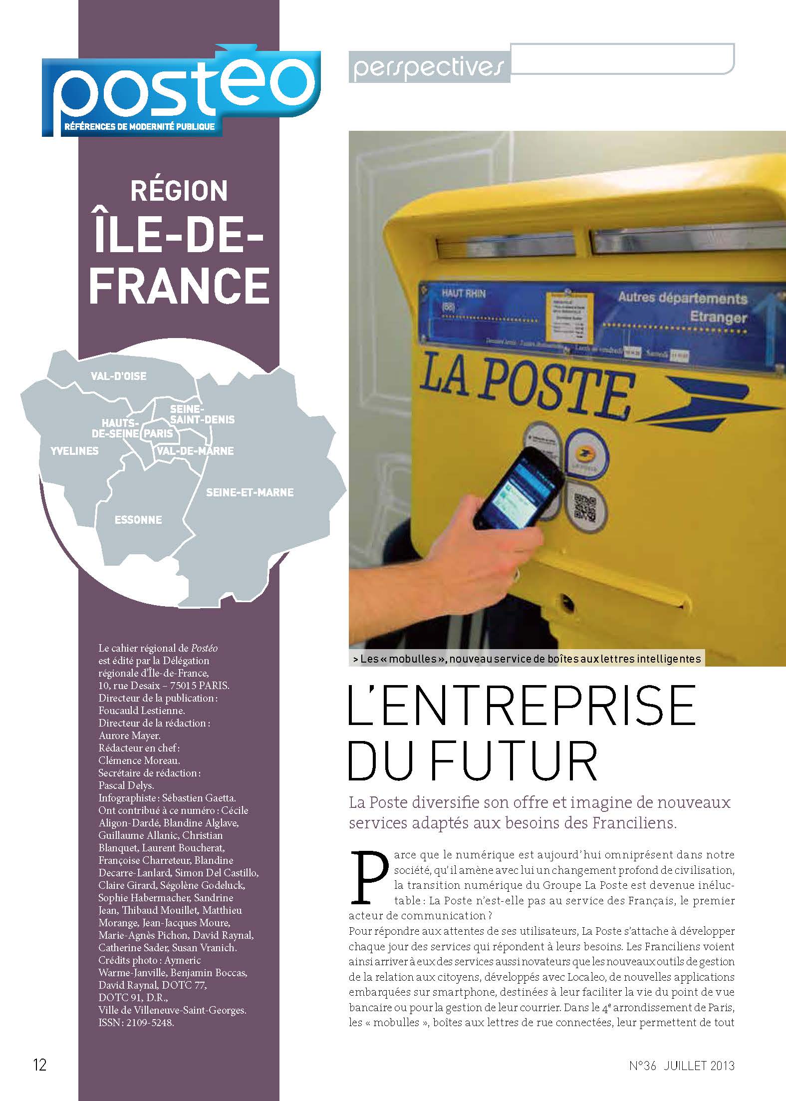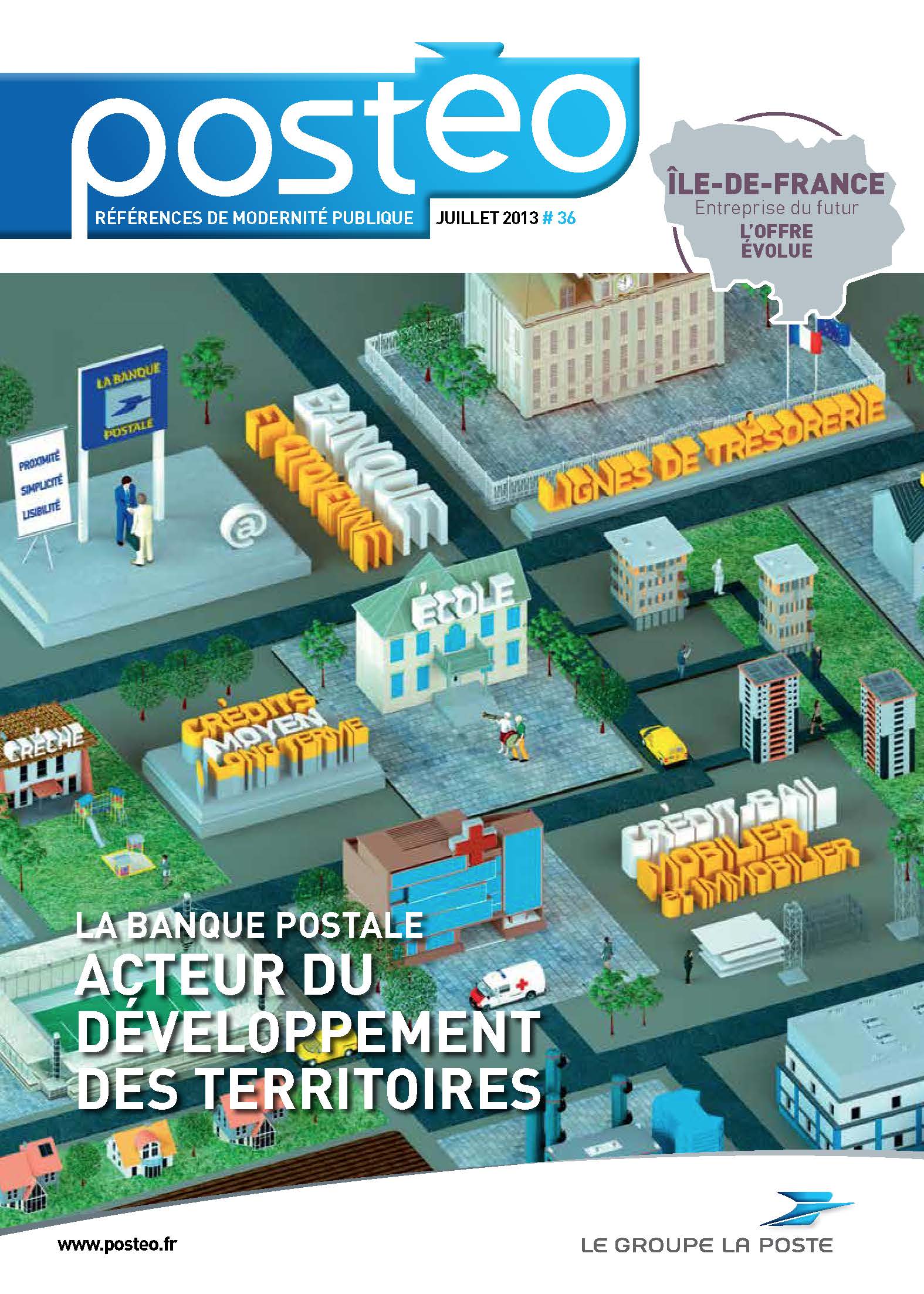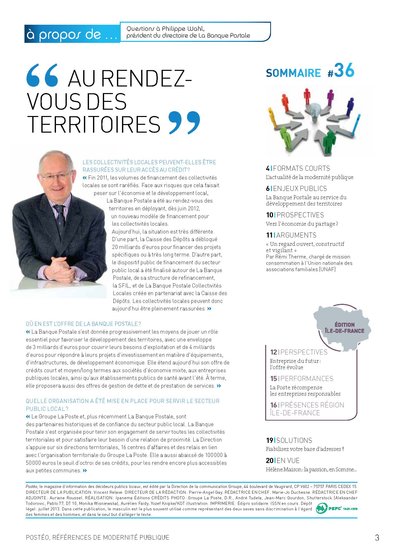 2012/2013 • Ce magazine trimestriel du groupe La Poste, à destination des élus et partenaires locaux, change de peau. Il va porter celle que j’ai concoctée avec notre équipe graphique (charte de la nouvelle formule à la clé). La difficulté réside dans le mode d’élaboration du magazine qui, pour affirmer sa proximité, donne la main aux agences régionales du Groupe pour réaliser « leurs » pages. Gabarits, calibrages et conseils sont donnés en amont. Il faut donc à chaque numéro, outre les pages nationales communes, éditer toutes celles des différentes régions. Gros trafic de pages, et bonnes négociations… La formule me survivra, jusqu’à l’été 2015, ce qui est un score honorable.
